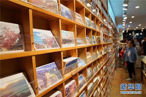 8月10日,游客在大理古城一旅游纪念品店铺挑选明信片。新华社记者 秦晴 摄