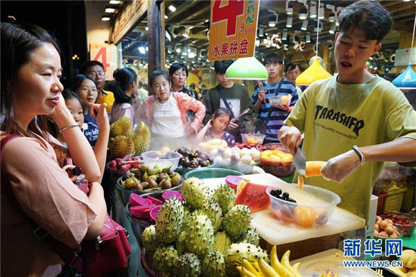 8月10日,游客在大理古城一店铺购买水果拼盘。新华社记者 秦晴 摄