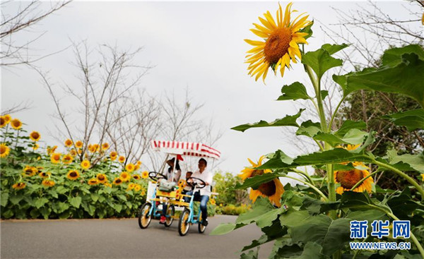 10月7日,人们骑车穿行在花田间的小路上。新华社记者 方喆 摄