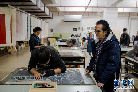 12月5日,在普洱学院版画工作室,艺术学院学生陈铎(左)在张晓春老师指导下制作绝版木刻版画。近年来,普洱学院积极推动绝版木刻版画艺术的传承与发展,已培训数百名学生。 绝版木刻是在传统套色木刻基础上发展起来的一种凸版技法,由于刻印完最后一版后不能留下再印,亦被称为绝版套色木刻。上世纪80年代,绝版木刻发源于云南普洱,历经30余年发展,现已成为中国四大版画流派之一。 新华社记者 胡超 摄
