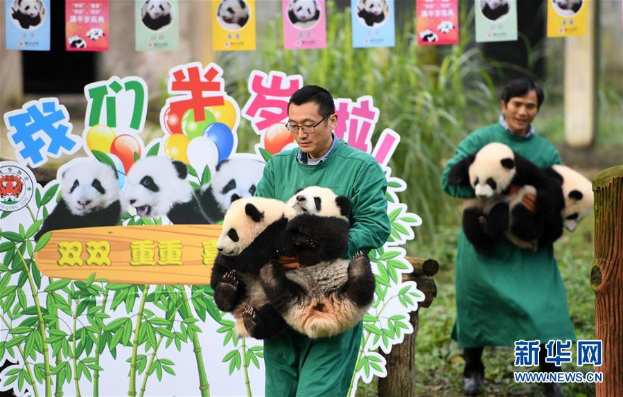 12月22日,饲养员怀抱大熊猫宝宝到户外运动。 当日,重庆动物园为4只大熊猫宝宝“双双”“重重”“喜喜”“庆庆”举行半岁生日庆祝活动。4只半岁大熊猫在饲养员的照料下,在熊猫馆运动场内玩耍、嬉戏,与市民游客一同过冬至。 新华社记者 唐奕 摄