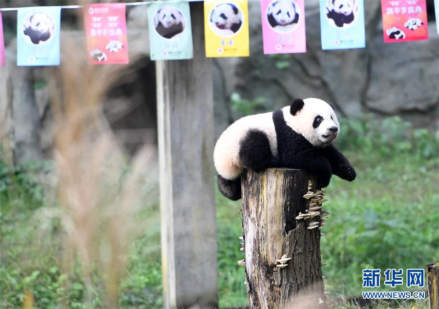 12月22日,重庆动物园1只半岁的大熊猫在户外活动。 当日,重庆动物园为4只大熊猫宝宝“双双”“重重”“喜喜”“庆庆”举行半岁生日庆祝活动。4只半岁大熊猫在饲养员的照料下,在熊猫馆运动场内玩耍、嬉戏,与市民游客一同过冬至。 新华社记者 唐奕 摄