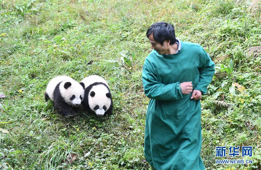 12月22日,饲养员引导两只半岁大熊猫在户外运动。 当日,重庆动物园为4只大熊猫宝宝“双双”“重重”“喜喜”“庆庆”举行半岁生日庆祝活动。4只半岁大熊猫在饲养员的照料下,在熊猫馆运动场内玩耍、嬉戏,与市民游客一同过冬至。 新华社记者 唐奕 摄