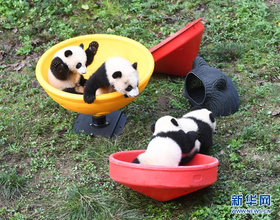 12月22日,重庆动物园4只半岁大熊猫在玩耍。 当日,重庆动物园为4只大熊猫宝宝“双双”“重重”“喜喜”“庆庆”举行半岁生日庆祝活动。4只半岁大熊猫在饲养员的照料下,在熊猫馆运动场内玩耍、嬉戏,与市民游客一同过冬至。 新华社记者 唐奕 摄