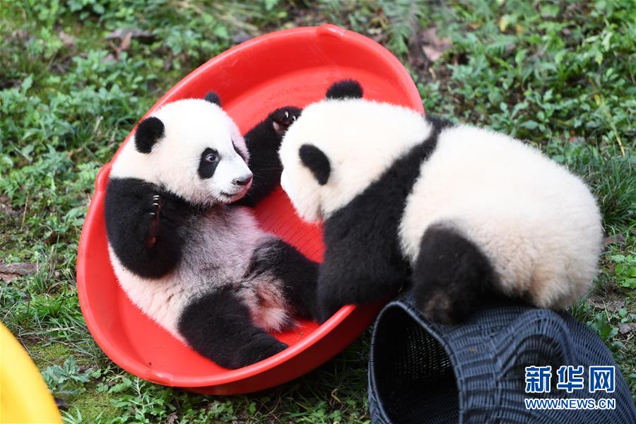 12月22日,重庆动物园两只半岁大熊猫在玩耍。 当日,重庆动物园为4只大熊猫宝宝“双双”“重重”“喜喜”“庆庆”举行半岁生日庆祝活动。4只半岁大熊猫在饲养员的照料下,在熊猫馆运动场内玩耍、嬉戏,与市民游客一同过冬至。 新华社记者 唐奕 摄