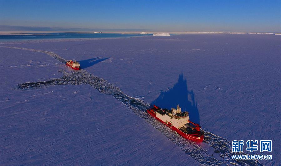 在中山站附近海域的“雪龙2”号(右)与“雪龙”号(11月21日无人机拍摄)。新华社记者 刘诗平 摄