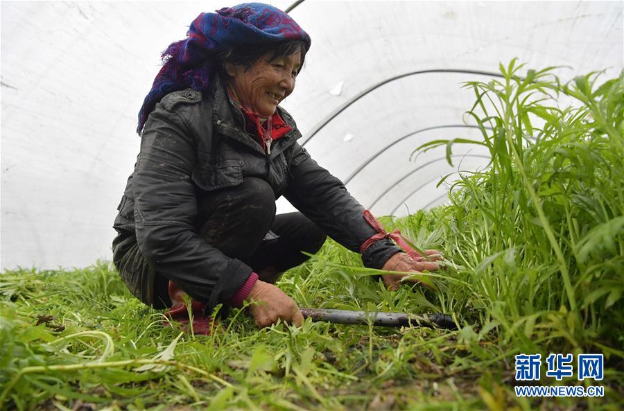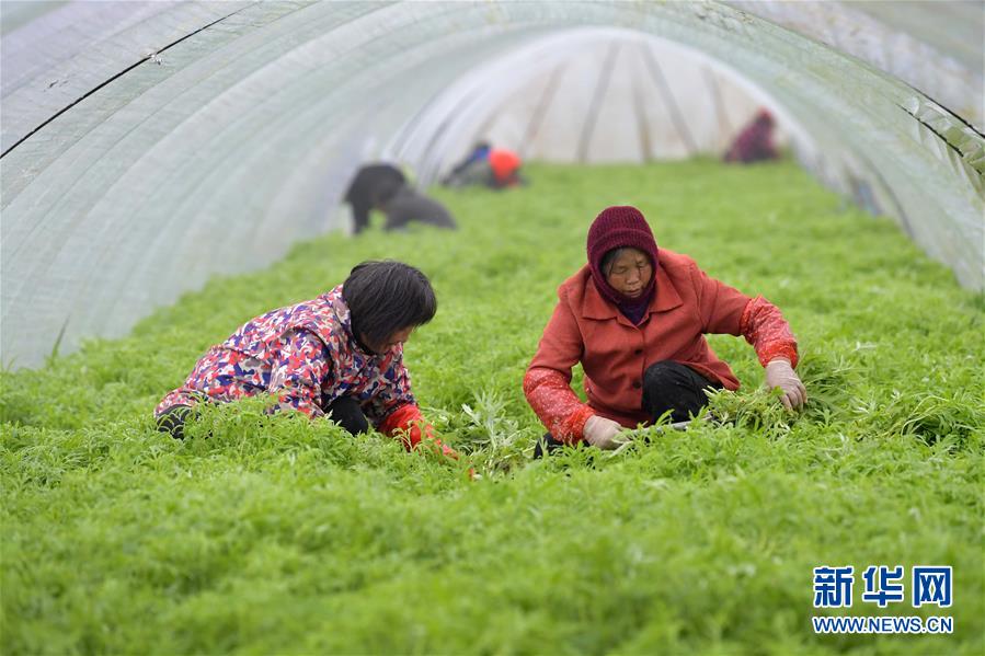 12月24日,在南昌县幽兰镇竹林村藜蒿种植合作社内,当地农户在温棚内收割藜蒿。 近年来,江西省南昌市南昌县幽兰镇大力发展具有地域特色的藜蒿产业,先后建立10余个藜蒿种植基地,种植规模达到6000亩。此外,藜蒿种植基地还以合作社的形式为村民提供劳动岗位,带动贫困户增收。 新华社记者 彭昭之 摄