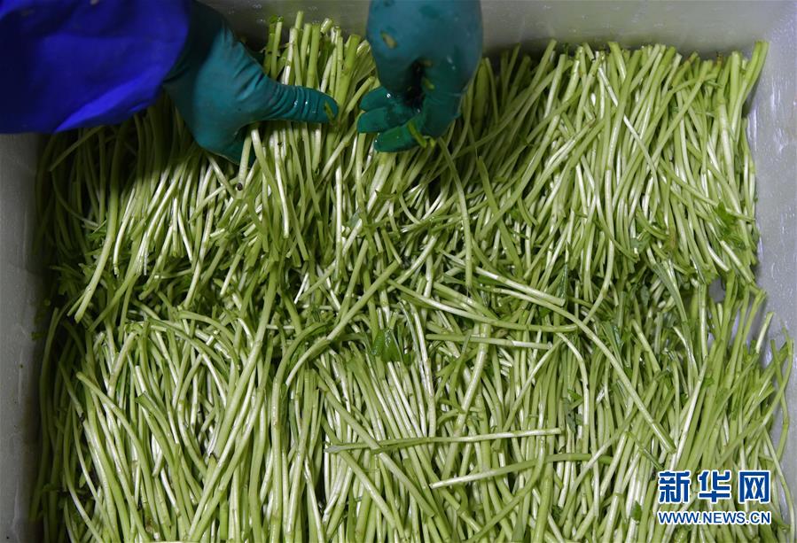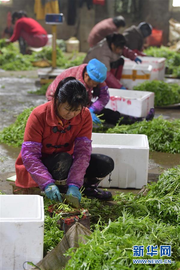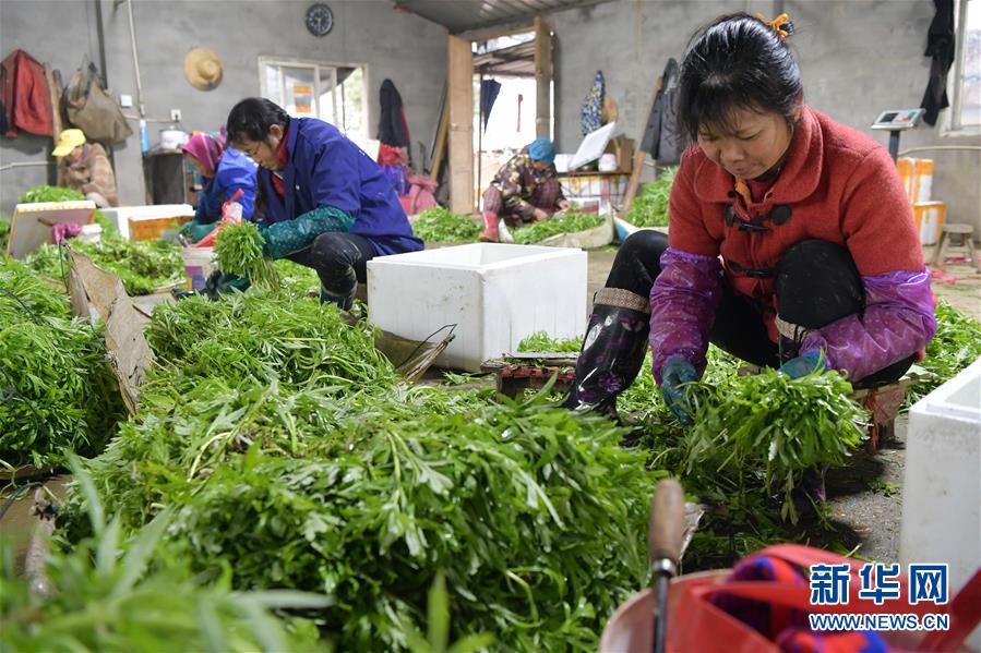 12月24日,在南昌县幽兰镇竹林村藜蒿种植合作社内,当地农户在处理刚收割的藜蒿准备装箱外销。 近年来,江西省南昌市南昌县幽兰镇大力发展具有地域特色的藜蒿产业,先后建立10余个藜蒿种植基地,种植规模达到6000亩。此外,藜蒿种植基地还以合作社的形式为村民提供劳动岗位,带动贫困户增收。 新华社记者 彭昭之 摄