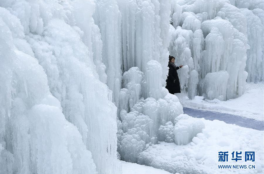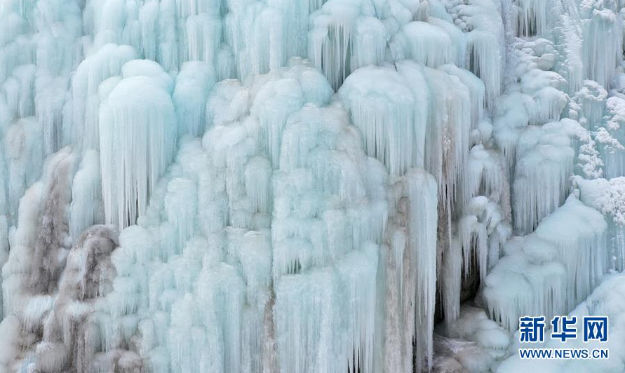这是1月7日拍摄的贺兰山岩画景区内的冰瀑景观(无人机照片)。 近日,宁夏贺兰山岩画景区内,自然山泉冻结冰瀑和人造冰瀑景观相结合,形成多处冰瀑景观,山间形态各异的冰挂、冰柱鬼斧神工,蔚为壮观,吸引众多游客前来观赏。 新华社记者 王鹏 摄