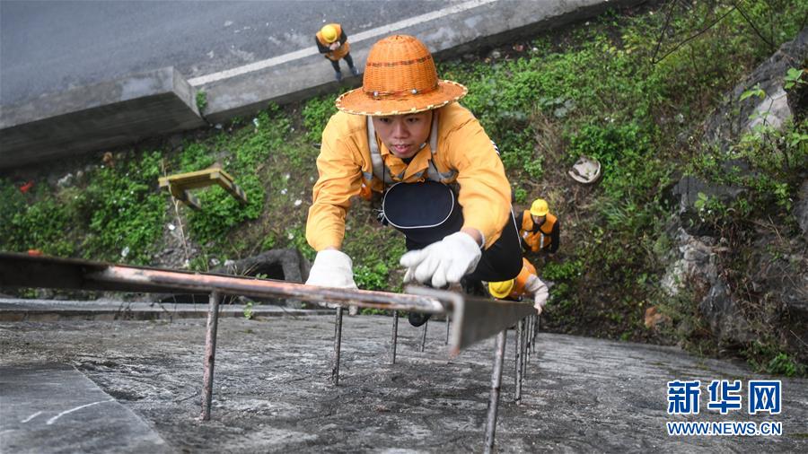 1月14日,百色工务段白水河桥隧工区班组成员攀梯上山开展巡查工作。 在中国铁路南宁局集团公司百色工务段白水河桥隧工区,有一个由14名工人组成的班组。他们常年像“爬山虎”一样行走攀爬在地形险峻、云雾缭绕的高山上,负责南昆铁路辖区路段的搜山扫石工作,清除一切可能危害铁路行车安全的因素,保障旅客出行安全。 新华社记者 张爱林 摄