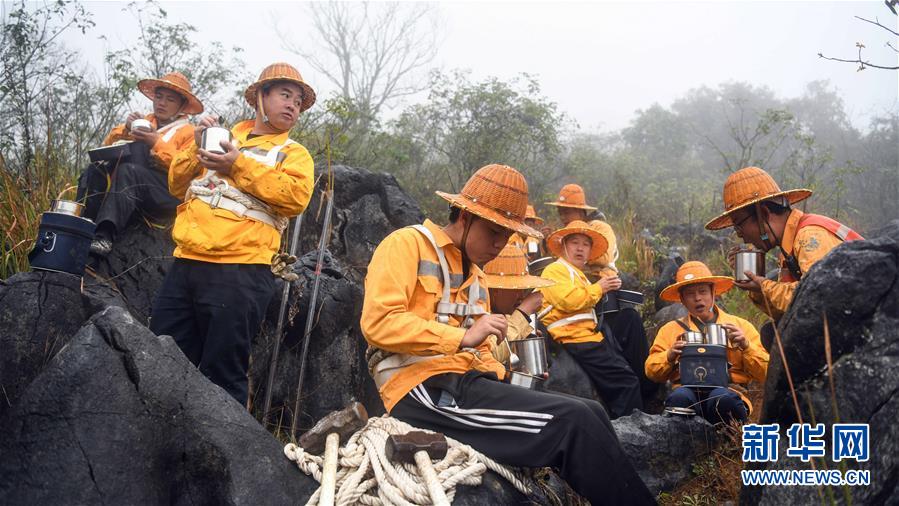 1月14日,百色工务段白水河桥隧工区班组成员在工作间隙吃午饭。 在中国铁路南宁局集团公司百色工务段白水河桥隧工区,有一个由14名工人组成的班组。他们常年像“爬山虎”一样行走攀爬在地形险峻、云雾缭绕的高山上,负责南昆铁路辖区路段的搜山扫石工作,清除一切可能危害铁路行车安全的因素,保障旅客出行安全。 新华社记者 张爱林 摄