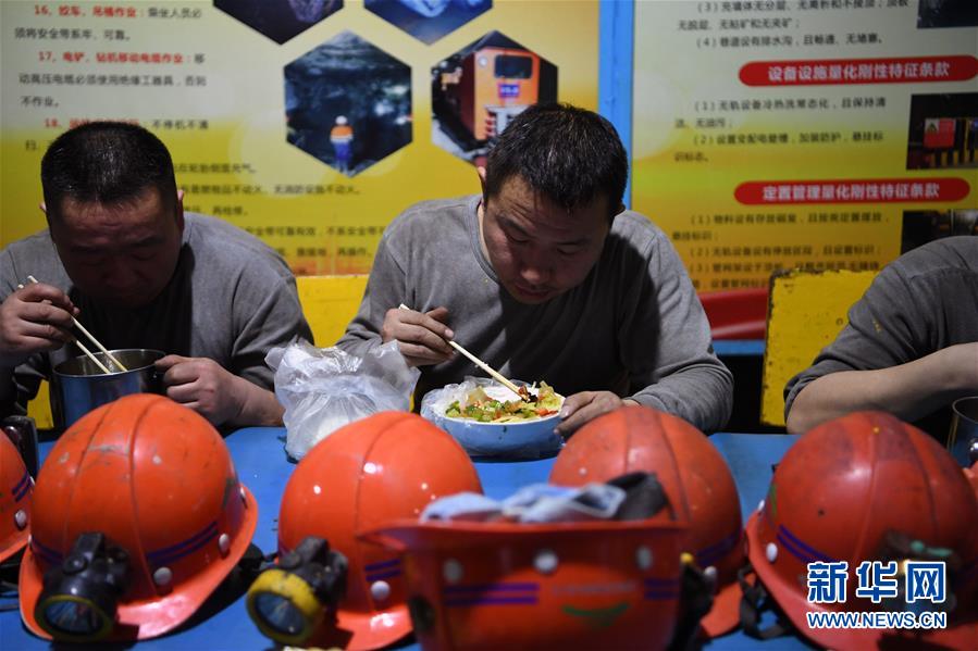 1月14日,在金川集团三矿区采矿工区井下食堂,工人们在吃午饭。 春节临近,位于甘肃河西走廊的中国“镍都”金昌市寒意逼人,但在金川集团股份有限公司地面以下600多米的三矿区各生产工区依旧一派热火朝天的工作场景。这里全年24小时生产,工人们坚守各自岗位,确保井下作业安全有序。 新华社记者 马宁 摄