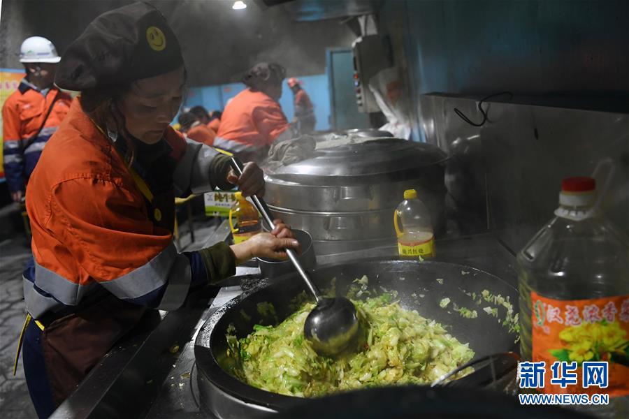 1月14日,在金川集团三矿区采矿工区井下食堂,后勤服务人员为工人准备午饭。 春节临近,位于甘肃河西走廊的中国“镍都”金昌市寒意逼人,但在金川集团股份有限公司地面以下600多米的三矿区各生产工区依旧一派热火朝天的工作场景。这里全年24小时生产,工人们坚守各自岗位,确保井下作业安全有序。 新华社记者 马宁 摄