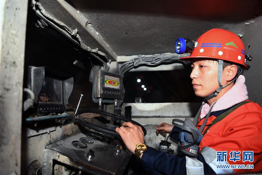 1月14日,金川集团三矿区采矿工区工人刘非在操作铲运机。 春节临近,位于甘肃河西走廊的中国“镍都”金昌市寒意逼人,但在金川集团股份有限公司地面以下600多米的三矿区各生产工区依旧一派热火朝天的工作场景。这里全年24小时生产,工人们坚守各自岗位,确保井下作业安全有序。 新华社记者 马宁 摄