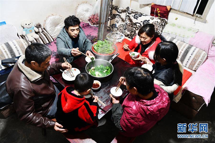 1月21日晚,贵州省黔西县太来乡硐口村外出务工村民王应军(后左)与家人共进晚餐。 春节将至,贵州省毕节市黔西县在外务工的人们纷纷返回家乡,他们换乘高铁、汽车,有的还要骑摩托车……只为赶回家乡与家人团聚。近年来,随着贵州县县通高速、乡乡通油路、村村通水泥路、组组通公路的“大交通”网络逐渐形成,人们回家的“最后一公里”不再难。 新华社记者 杨文斌 摄