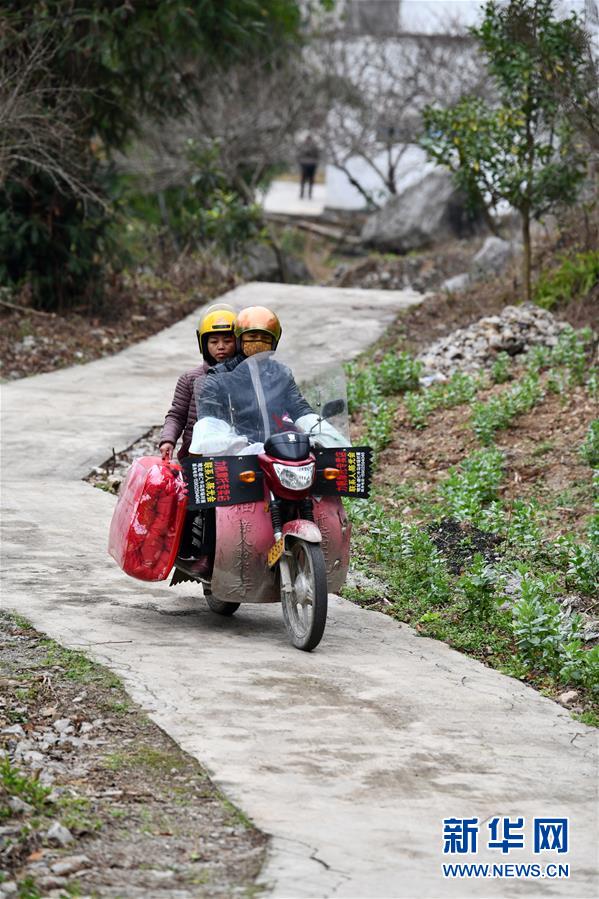1月22日,贵州省黔西县新仁乡化屋村外出务工村民杨文胜与妻子骑着摩托车行驶在返乡的串户硬化路上。 春节将至,贵州省毕节市黔西县在外务工的人们纷纷返回家乡,他们换乘高铁、汽车,有的还要骑摩托车……只为赶回家乡与家人团聚。近年来,随着贵州县县通高速、乡乡通油路、村村通水泥路、组组通公路的“大交通”网络逐渐形成,人们回家的“最后一公里”不再难。 新华社记者 杨文斌 摄