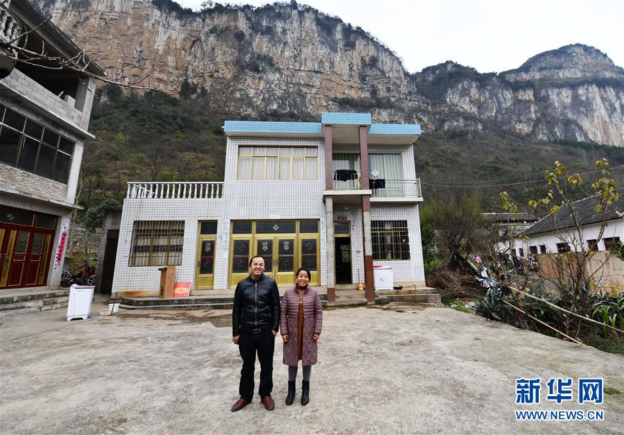 1月22日,在贵州省黔西县新仁乡化屋村,外出务工村民杨文胜与妻子回到家后在家门前合影。 春节将至,贵州省毕节市黔西县在外务工的人们纷纷返回家乡,他们换乘高铁、汽车,有的还要骑摩托车……只为赶回家乡与家人团聚。近年来,随着贵州县县通高速、乡乡通油路、村村通水泥路、组组通公路的“大交通”网络逐渐形成,人们回家的“最后一公里”不再难。 新华社记者 杨文斌 摄