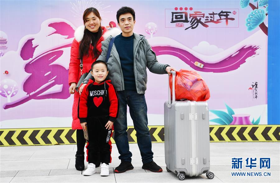 贵州省黔西县太来乡硐口村外出务工村民王应军与妻子、儿子从杭州东站乘坐高铁抵达黔西站后合影(1月21日摄)。 春节将至,贵州省毕节市黔西县在外务工的人们纷纷返回家乡,他们换乘高铁、汽车,有的还要骑摩托车……只为赶回家乡与家人团聚。近年来,随着贵州县县通高速、乡乡通油路、村村通水泥路、组组通公路的“大交通”网络逐渐形成,人们回家的“最后一公里”不再难。 新华社记者 杨文斌 摄