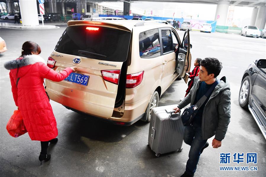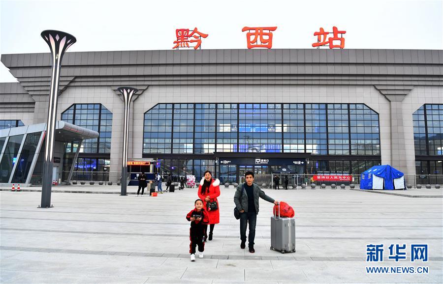 贵州省黔西县太来乡硐口村外出务工村民王应军与妻子、儿子从杭州东站乘坐高铁抵达黔西站(1月21日摄)。 春节将至,贵州省毕节市黔西县在外务工的人们纷纷返回家乡,他们换乘高铁、汽车,有的还要骑摩托车……只为赶回家乡与家人团聚。近年来,随着贵州县县通高速、乡乡通油路、村村通水泥路、组组通公路的“大交通”网络逐渐形成,人们回家的“最后一公里”不再难。 新华社记者 杨文斌 摄