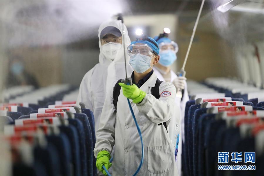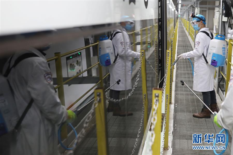 2月2日,工作人员对动车组车厢进行消毒。 为做好疫情防控,保障乘客安全,中国铁路成都局集团有限公司贵阳车辆段贵阳北动车运用所与中国铁路成都局集团有限公司贵阳疾病预防控制中心的工作人员,近日从每天晚上七点至第二天凌晨五点半,对动车运用所的所有终到列车开展消毒防疫工作,确保每一列从贵阳开出的列车都经过严格细致的消毒。 新华社记者 欧东衢 摄