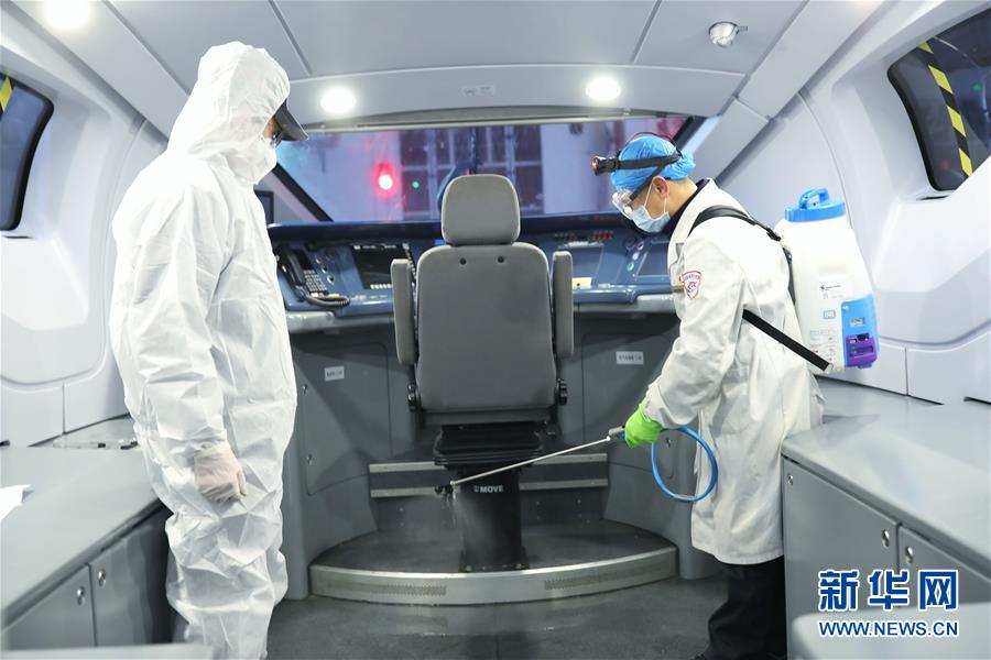 2月2日,工作人员对动车组驾驶室进行消毒。 为做好疫情防控,保障乘客安全,中国铁路成都局集团有限公司贵阳车辆段贵阳北动车运用所与中国铁路成都局集团有限公司贵阳疾病预防控制中心的工作人员,近日从每天晚上七点至第二天凌晨五点半,对动车运用所的所有终到列车开展消毒防疫工作,确保每一列从贵阳开出的列车都经过严格细致的消毒。 新华社记者 欧东衢 摄