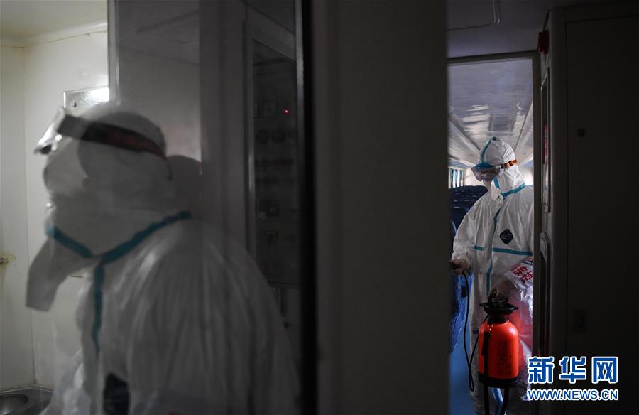 2月3日,中国铁路兰州局集团有限公司疾病预防控制所工作人员杨凯(右)在K9668次列车上进行消毒作业。 为做好新型冠状病毒感染的肺炎疫情防控工作,中国铁路兰州局集团有限公司疾病预防控制所的工作人员近期全天候轮班上岗,对兰州火车站的列车开展消毒防疫工作,确保列车重点部位经过严格细致的消毒。 新华社记者 陈斌 摄