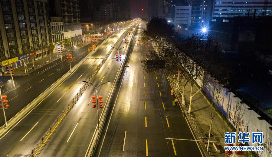 2月3日清晨,江岸环卫集团工作人员在武汉解放大道路旁进行清扫作业。 2月初的武汉街头人迹寥寥,只有亮橙色工装和淡蓝色口罩包裹下的环卫工人时不时出现在马路边。非常时期,他们坚守岗位,为保持城市的清洁默默奉献。 新华社记者 才扬 摄
