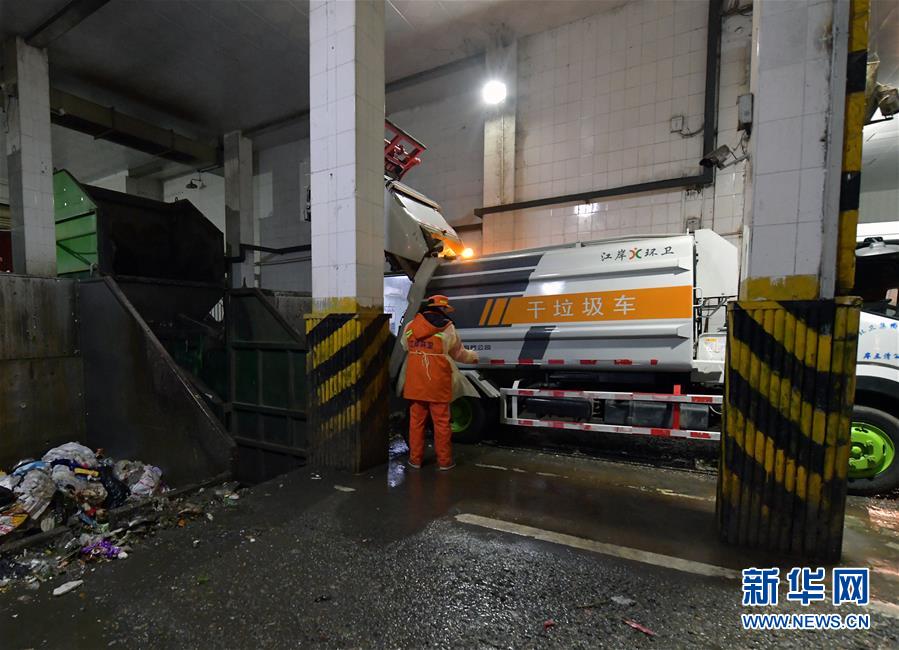 2月1日晚上,江岸环卫集团工作人员在百步亭垃圾转运站卸垃圾。 2月初的武汉街头人迹寥寥,只有亮橙色工装和淡蓝色口罩包裹下的环卫工人时不时出现在马路边。非常时期,他们坚守岗位,为保持城市的清洁默默奉献。 新华社记者 李贺 摄