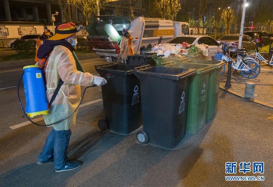 2月1日晚上,江岸环卫集团工作人员对武汉市六合路附近的垃圾桶进行消毒。 2月初的武汉街头人迹寥寥,只有亮橙色工装和淡蓝色口罩包裹下的环卫工人时不时出现在马路边。非常时期,他们坚守岗位,为保持城市的清洁默默奉献。 新华社记者 才扬 摄