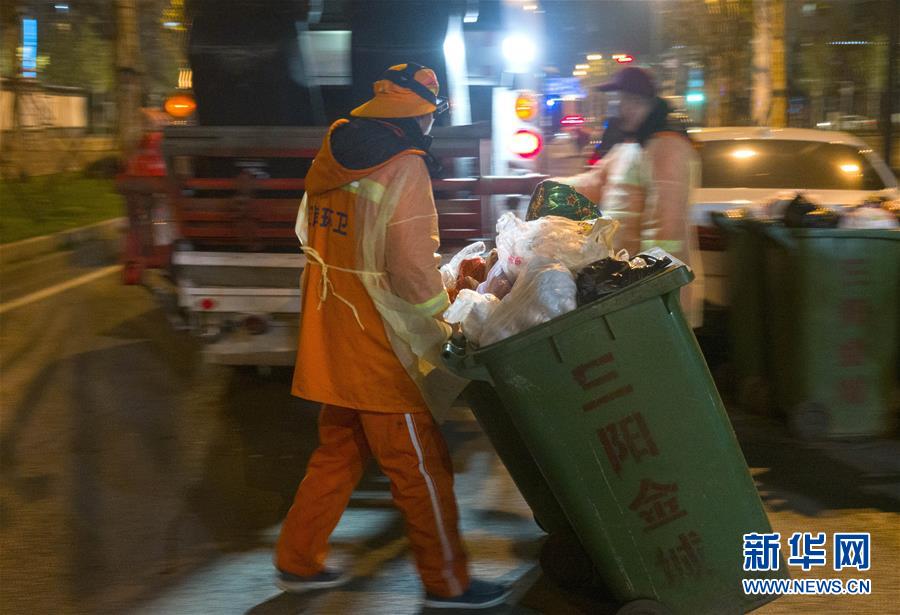 2月1日晚上,江岸环卫集团工作人员在武汉市六合路附近清运垃圾。 2月初的武汉街头人迹寥寥,只有亮橙色工装和淡蓝色口罩包裹下的环卫工人时不时出现在马路边。非常时期,他们坚守岗位,为保持城市的清洁默默奉献。 新华社记者 才扬 摄