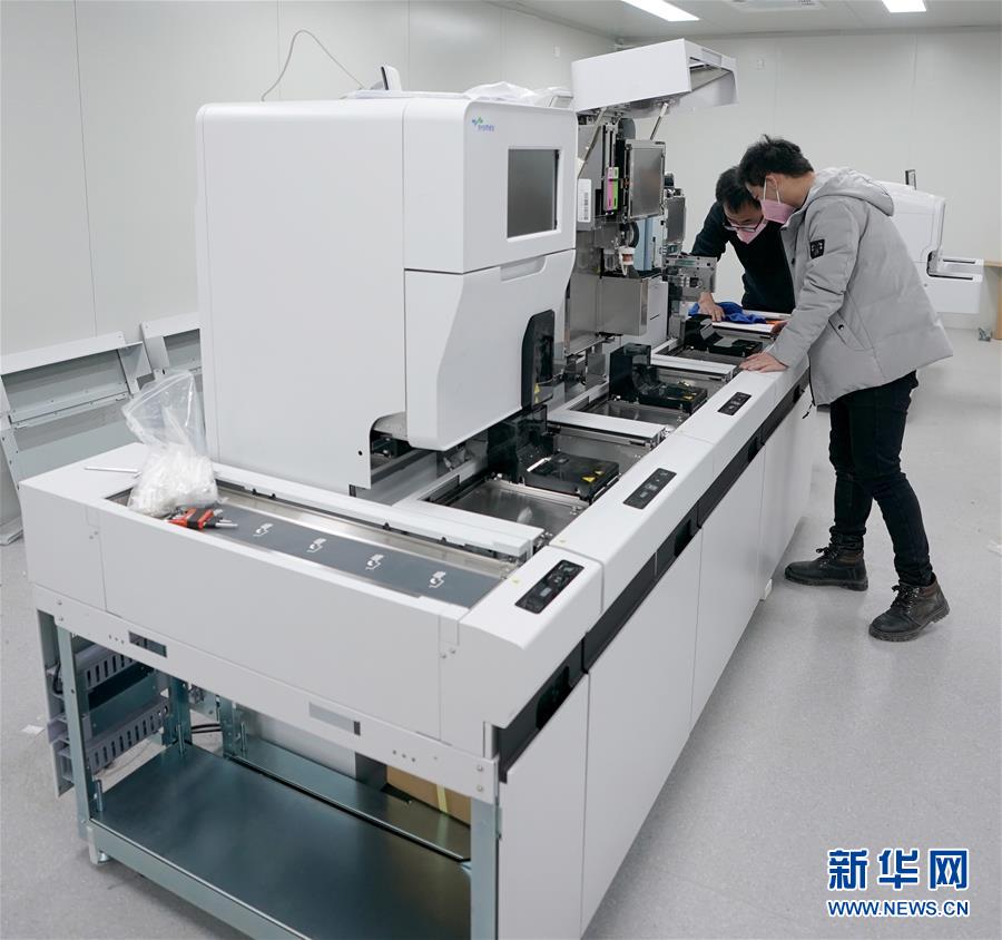 2月5日,技术人员在建设中的武汉雷神山医院内调试尿液分析仪。 当日,武汉雷神山医院主体建设已经完成,施工进入冲刺阶段。 新华社记者王毓国摄