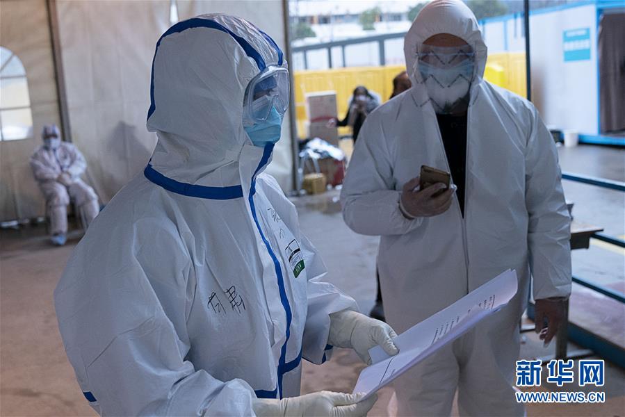 2月10日,在武汉客厅方舱医院,医护人员在门口准备接受新入院的患者。 武汉方舱医院从2月5日收治首批患者以来,运行平稳有序,患者在医护人员的精心照顾下调养身体,等待痊愈。 新华社记者 熊琦 摄