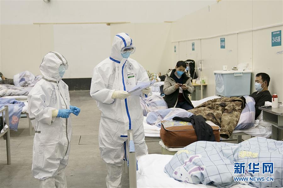 2月10日,在武汉客厅方舱医院,医护人员在询问患者病情。 武汉方舱医院从2月5日收治首批患者以来,运行平稳有序,患者在医护人员的精心照顾下调养身体,等待痊愈。 新华社记者 熊琦 摄