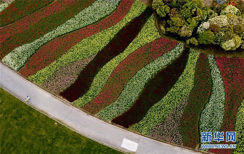 这是4月14日拍摄的上海世纪公园“七彩花田”(无人机照片)。 春暖花开时节,坐落于浦东新区的上海世纪公园迎来美丽斑斓的“彩色季”。世纪公园拥有大面积的草坪、森林、湖泊,是深受上海市民喜爱的观景和休闲之地。 新华社记者 刘颖 摄