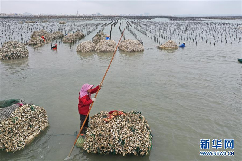 4月21日,在福建泉州南安市石井镇,渔民在近海滩涂进行海蛎育苗(无人机拍摄)。新华社发(王毅 摄)