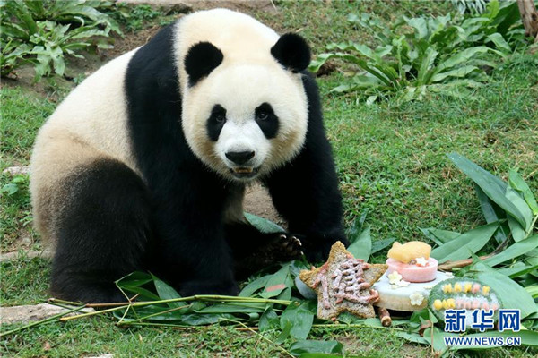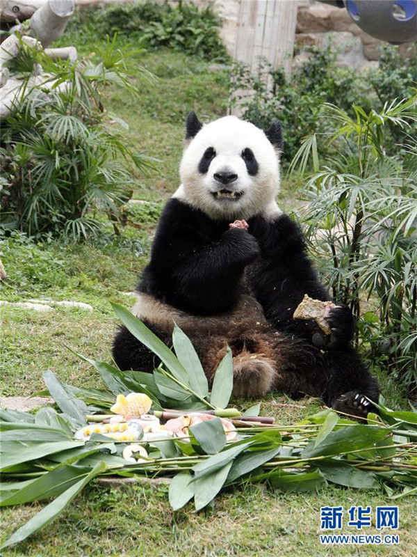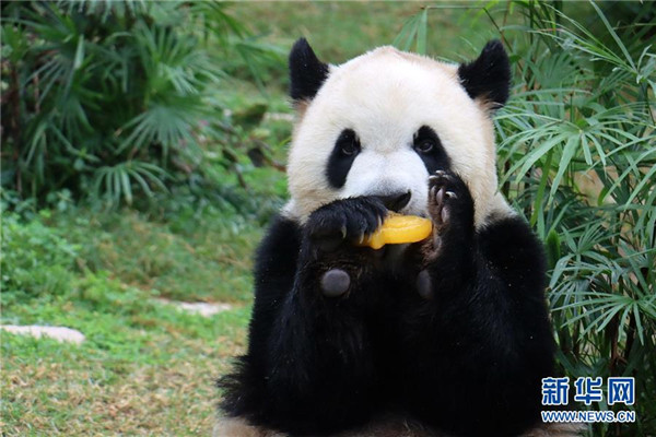 6月26日,大熊猫“康康”在享用水果雪条。 当日,中央政府赠送澳门特区政府的大熊猫“开开”“心心”的双胞胎儿子“健健”“康康”迎来4周岁生日。饲养员用水果制作美味的冰蛋糕,为“健健”“康康”送上祝福。 新华社发