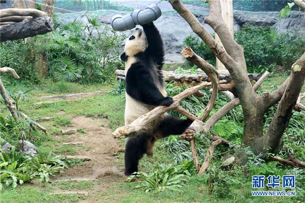 6月26日,大熊猫“健健”在玩耍。 当日,中央政府赠送澳门特区政府的大熊猫“开开”“心心”的双胞胎儿子“健健”“康康”迎来4周岁生日。饲养员用水果制作美味的冰蛋糕,为“健健”“康康”送上祝福。 新华社发