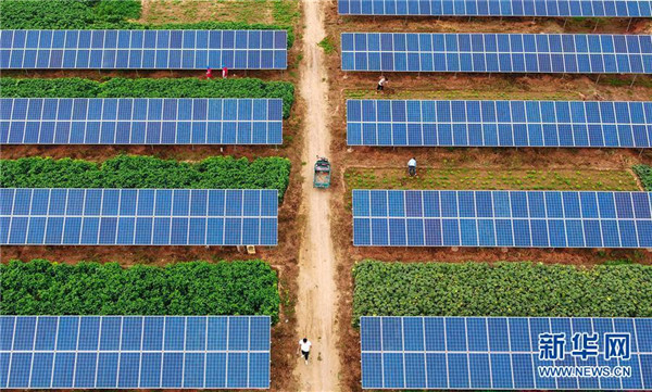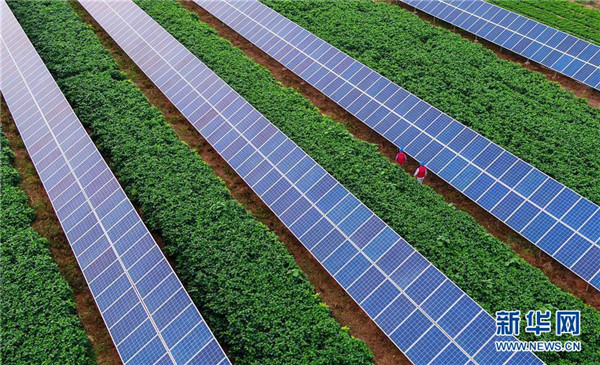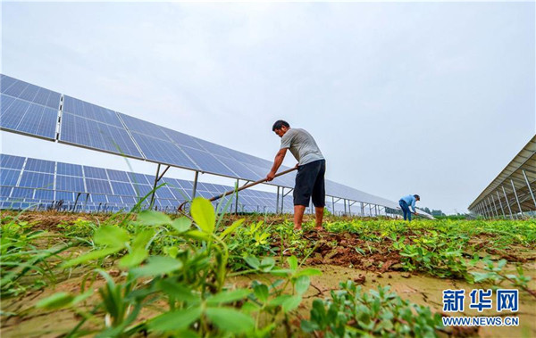 7月15日,村民在魏县北台头乡西野马村“农光互补”光伏扶贫发电场的农田里劳作。 近年来,河北省魏县采取“政府+企业+农户”的合作模式,积极推进“农光互补”光伏电站建设。上方光伏板发电,光伏电板下发展种植、养殖等农业产业,带动农民增收。 新华社记者 王晓 摄