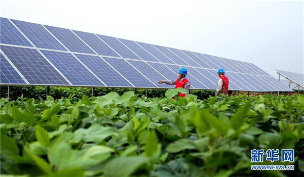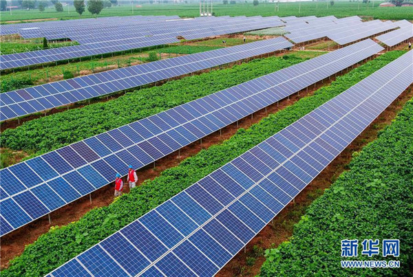 7月15日,在魏县北台头乡西野马村“农光互补”光伏扶贫发电场,供电公司工作人员在巡视光伏电板。 近年来,河北省魏县采取“政府+企业+农户”的合作模式,积极推进“农光互补”光伏电站建设。上方光伏板发电,光伏电板下发展种植、养殖等农业产业,带动农民增收。 新华社记者 王晓 摄