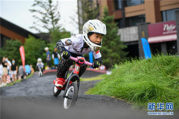 7月19日,小朋友在吉林市万科松花湖度假区的山地车公园骑山地车。 夏日时节,吉林省吉林市的万科松花湖度假区利用滑雪场的地形优势,增添了高山花海、彩虹滑道等休闲旅游项目,吸引游客前来观光游览。 新华社发(颜麟蕴摄)