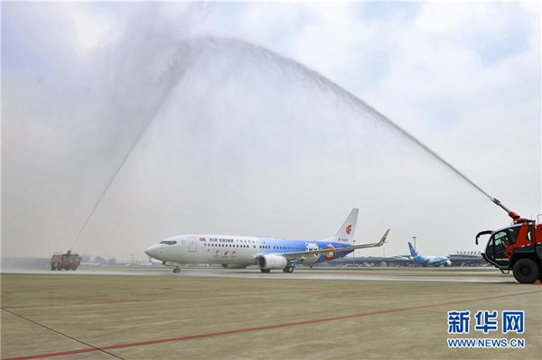 9月5日,在成都双流国际机场,“冬奥冰雪号”彩绘飞机落地后完成水门仪式。 当日,从北京出发的北京2022年冬奥会和冬残奥会首架主题彩绘飞机“冬奥冰雪号”抵达成都完成首航。 新华社发(中国国际航空股份有限公司供图)