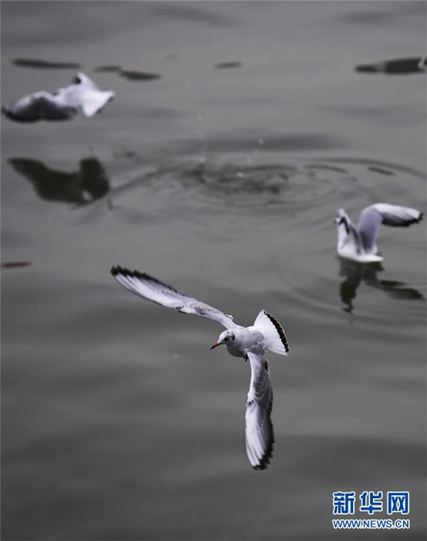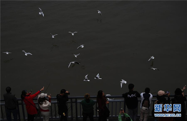 11月5日,人们在重庆弹子石码头观赏红嘴鸥。 近日,众多红嘴鸥“到访”重庆长江与嘉陵江交汇一带,给“山水之城”重庆增添了生机和亮色。 新华社记者王全超摄