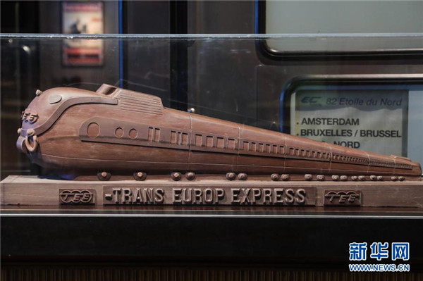 这是12月15日在比利时布鲁塞尔火车世界博物馆拍摄的一件艺术家以全欧快车为原型而创作的巧克力火车雕塑。