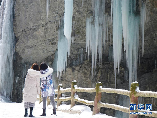 12月16日,游客在官鹅沟一处冰瀑前拍照。 连日来,持续低温让位于甘肃省陇南市宕昌县境内的官鹅沟国家森林公园银装素裹,景区内群山湖泊被冰雪覆盖,一道道冰瀑高挂悬崖,宛若一幅美丽画卷。 新华社记者 郎兵兵 摄