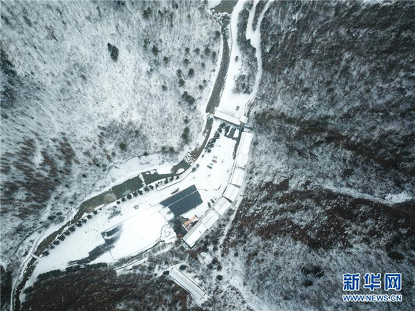 这是12月16日拍摄的官鹅沟雪景(无人机照片)。 连日来,持续低温让位于甘肃省陇南市宕昌县境内的官鹅沟国家森林公园银装素裹,景区内群山湖泊被冰雪覆盖,一道道冰瀑高挂悬崖,宛若一幅美丽画卷。 新华社记者 郎兵兵 摄