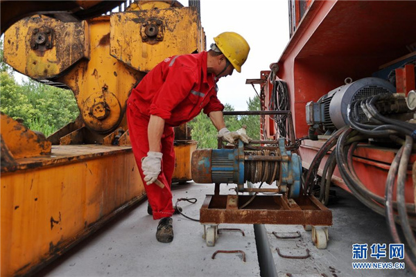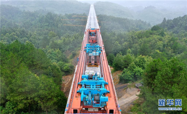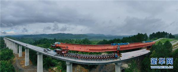 7月8日,在贵南高铁贵州段五标施工现场,工作人员正在进行箱梁架设。新华社记者 刘续 摄