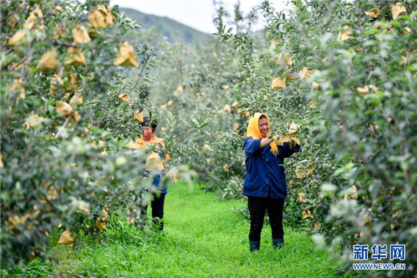 7月11日,工人在河北省滦州市鸡冠山生态农业产业园的梯田内打理套袋种植的苹果。新华社记者 牟宇 摄