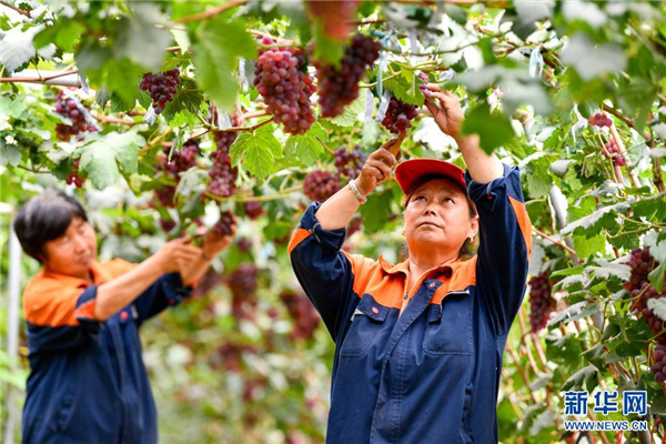 7月11日,工人在河北省滦州市鸡冠山生态农业产业园内采摘葡萄。新华社记者 牟宇 摄