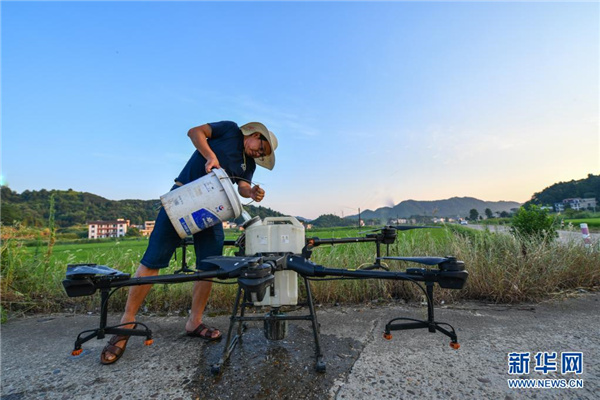 7月14日,在湖南省衡阳市常宁市洋泉镇土桥村,农技员给植保无人机加装生物农药。