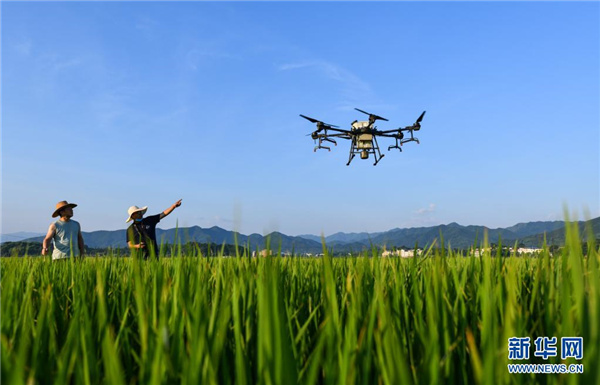 7月14日,在湖南省衡阳市常宁市洋泉镇土桥村,农技员操作植保无人机为水稻进行飞防作业。